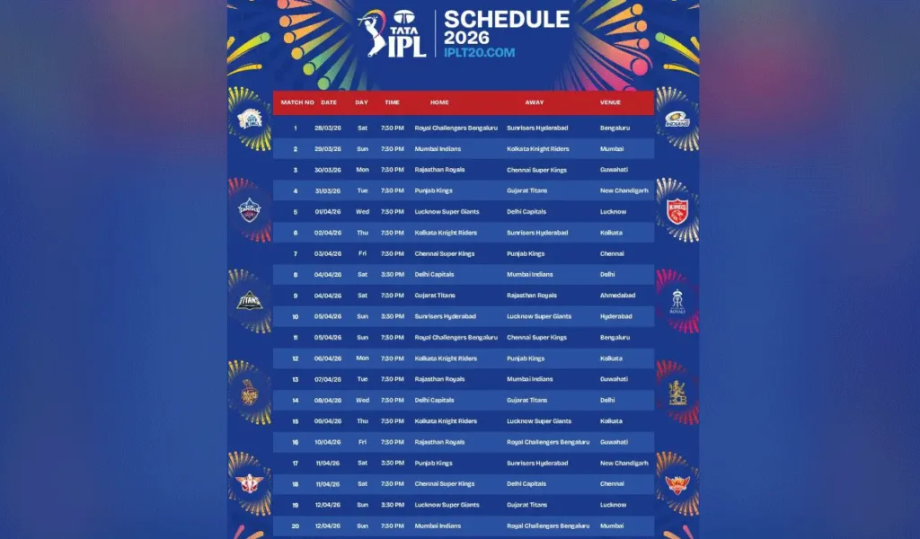 IPL 2026 schedule revealed: Opening clash between RCB and Sunrisers Hyderabad kicks off another thrilling season of the Indian Premier League.